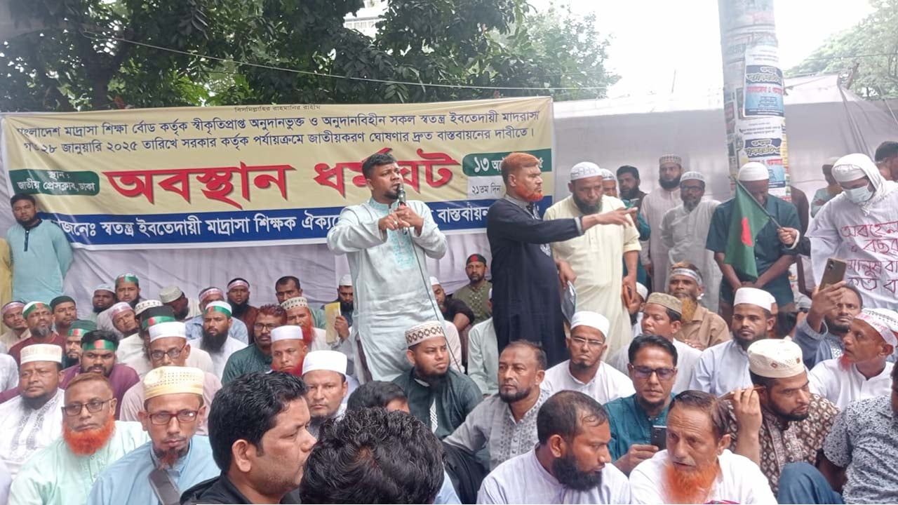 সরকার ঘোষিত জাতীয়করণের বাস্তবায়নের দাবিতে টানা ২১তম দিনের মতো অবস্থান ধর্মঘট পালন করছেন স্বীকৃতিপ্রাপ্ত, অনুদানভুক্ত ও অনুদানহীন স্বতন্ত্র ইবতেদায়ি মাদরাসার শিক্ষকরা। রোববার জাতীয় প্রেসক্লাবের সামনে অনুষ্ঠিত এই কর্মসূচিতে শিক্ষকরা জানিয়েছেন, জাতীয়করণ কার্যকর না হওয়া পর্যন্ত তারা আন্দোলন চালিয়ে যাবেন।