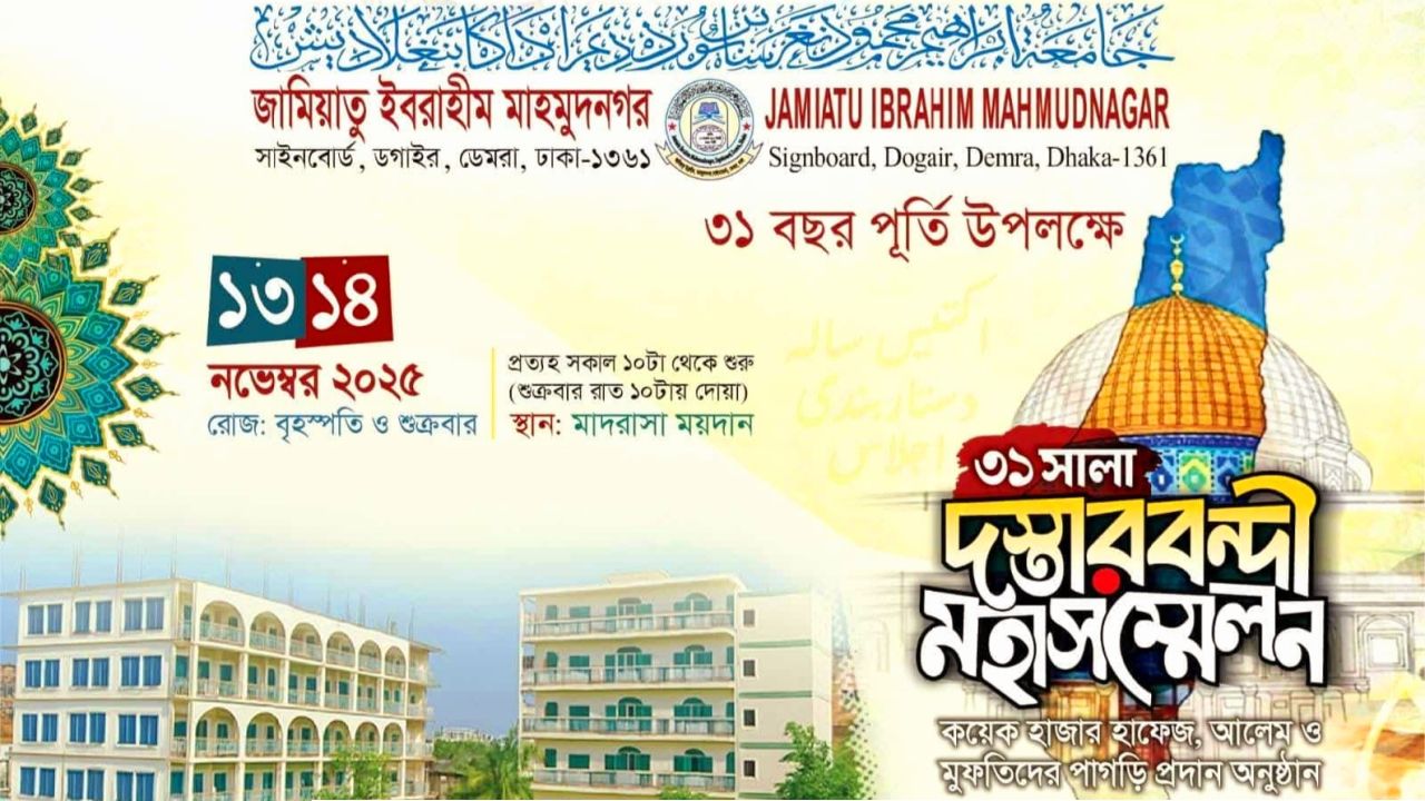 আগামী ১৩-১৪ নভেম্বর বৃহস্পতি ও শুক্রবার দেশের অন্যতম দ্বীনি শিক্ষাপ্রতিষ্ঠান জামিয়াতু ইবরাহীম মাহমুদনগর, সাইনবোর্ড, ডেমরা, ঢাকা-এর ৩১ বছর পূর্তি উপলক্ষে ২ দিনব্যাপী দস্তারবন্দী মহাসম্মেলন অনুষ্ঠিত হতে যাচ্ছে।
