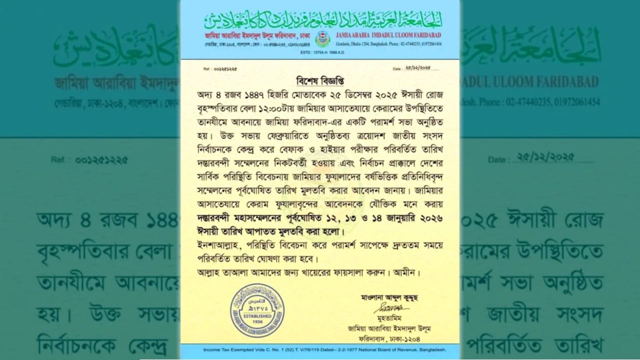 বৃহস্পতিবার বেলা ১২টায় জামিয়া ফরিদাবাদ প্রাঙ্গণে আসাতেযায়ে কেরাম এবং তানযীমের প্রতিনিধিদের উপস্থিতিতে এক গুরুত্বপূর্ণ সভা অনুষ্ঠিত হয়। সভায় জানানো হয়, ২০২৬ সালের ফেব্রুয়ারিতে বাংলাদেশের ১৩তম জাতীয় সংসদ নির্বাচন অনুষ্ঠিত হওয়ার কথা রয়েছে। এই নির্বাচনকে কেন্দ্র করে বেফাকুল মাদারিসিল আরাবিয়া বাংলাদেশ (বেফাক) এবং আল-হাইয়াতুল উলিয়ার পরীক্ষার তারিখ পরিবর্তন করা হয়েছে।