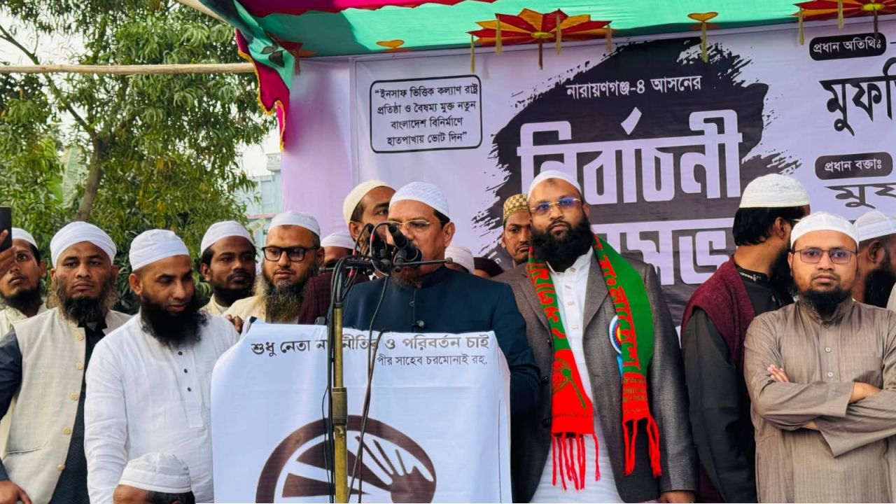 নারায়ণগঞ্জ-৪ (ফতুল্লা-সিদ্ধিরগঞ্জ) আসনের নির্বাচনী লড়াইয়ে উৎসবমুখর পরিবেশ সৃষ্টি হয়েছে। শুক্রবার ফতুল্লার ফাজেলপুর মাঠে ‘হাতপাখা’ প্রতীকের প্রার্থী মুফতী ইসমাইল সিরাজী আল মাদানীর সমর্থনে আয়োজিত বিশাল জনসভায় প্রধান অতিথি হিসেবে যোগ দেন ইসলামী আন্দোলন বাংলাদেশের আমীর পীর সাহেব চরমোনাই। হাজারো সমর্থকের উপস্থিতিতে এই জনসভাটি নির্বাচনী বৈতরণী পার হওয়ার এক বিশাল শক্তিমত্তায় পরিণত হয়।